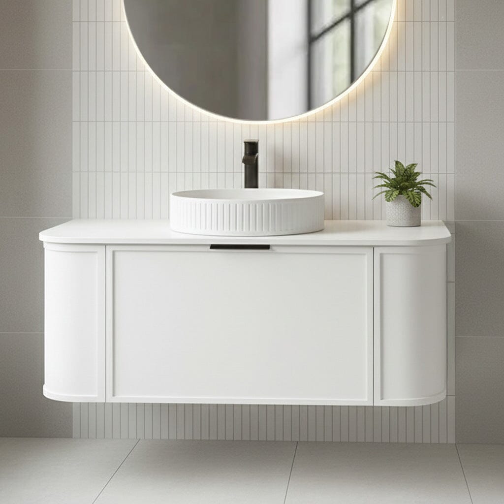 The York 1200mm Curved Wall Hung Bathroom Vanity Matte White by Arova seamlessly blends modern elegance with functional design, making it an eye-catching addition to modern bathroom. Crafted from eco-friendly E0 Grade plywood, The York matte white curved bathroom vanity is built for durability, high moisture resistance, and environmental safety, offering lasting quality and protection against swelling. The York bathroom vanity’s smooth, curved edges and matte white finish provide a clean, sophisticated look that complements various bathroom aesthetics. With its larger size, the 1200mm York vanity offers generous storage through the soft-close drawer and 2 side doors with adjustable shelves allowing for efficient organization of bathroom essentials. The wall-hung bathroom vanity design enhances the sense of openness in your bathroom, creating a spacious and airy feel.