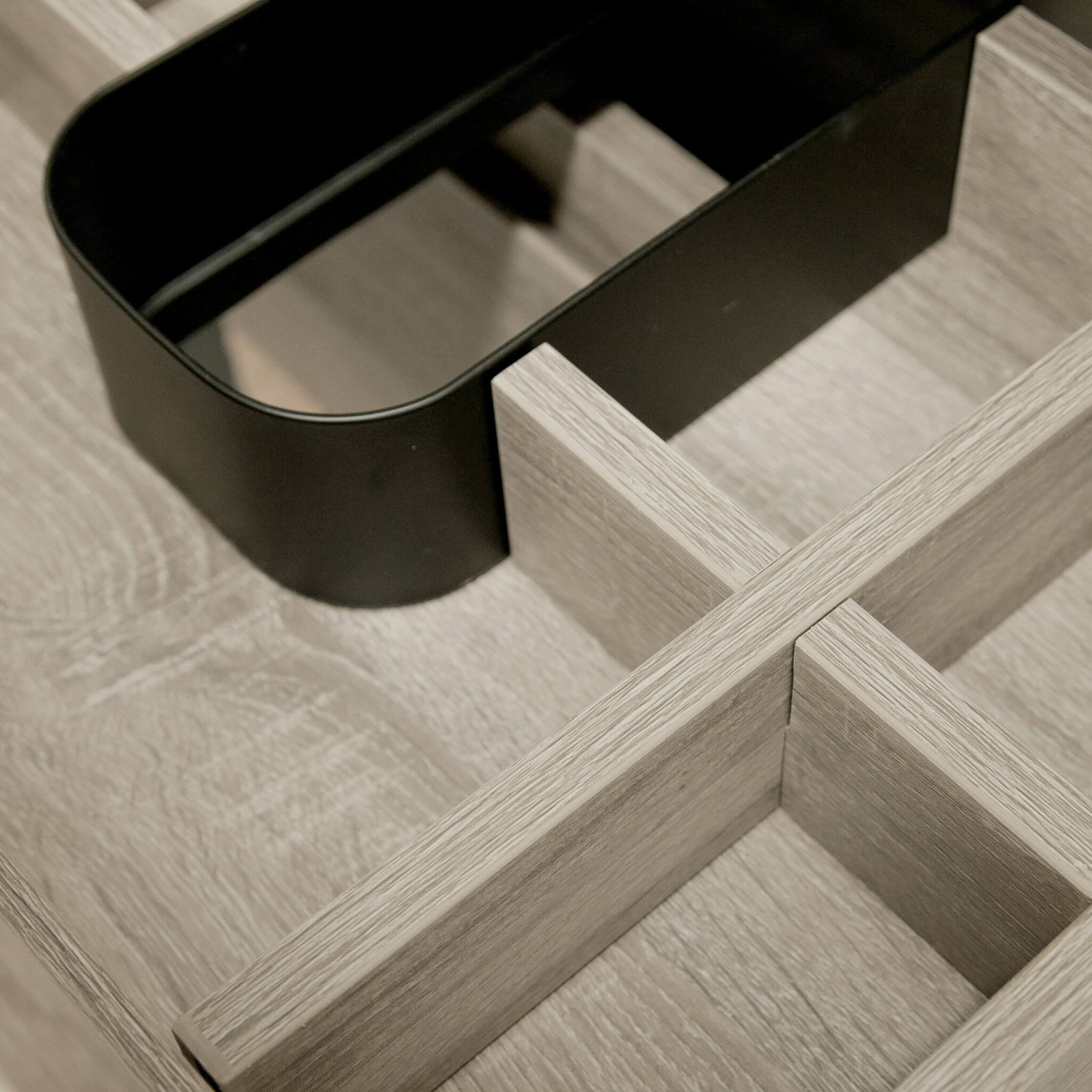 The KRIS 1200mm bathroom vanity in Caribbean Oak Grey by Arova is seriously beautiful and practical. This high quality vanity unit instantly uplifts the bathroom look by adding a sense of warmth and luxury. Kris wall mounted vanities comes with ultra wear textured surface in grey oak. Kris 120omm vanity comes with a double basin configuration, which is ideal for a shared busy bathroom or en-suite. You also have the option of an offset single basin mounted on the left or right hand side on our engineered stone top. Kris bathroom cabinets are designed with full extension drawers to ensure easy access. The top drawers come in a U scoop for easy plumbing and fitted with dividers for organising cosmetics and every day consumables. The bottom drawers allow large items that may not be required day to day.