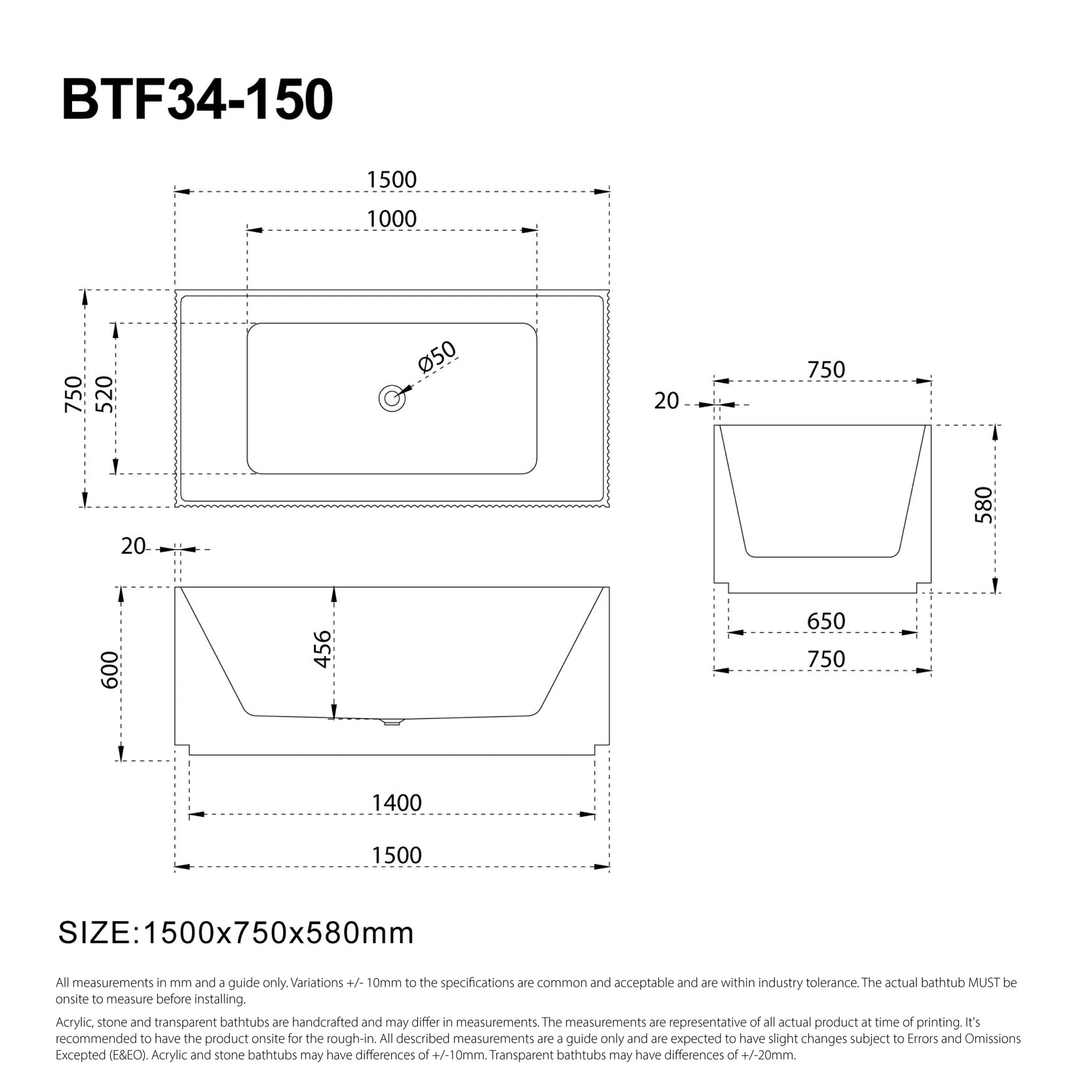 * Acrylic, stone and transparent bathtubs are handcrafted and may differ in measurements. The measurements are representative of all actual product at time of printing. It's recommended to have the product onsite for the rough-in. All described measurements are a guide only and are expected to have slight changes subject to Errors and Omissions Excepted (E&EO). Acrylic and stone bathtubs may have differences of +/-10mm. Transparent bathtubs may have differences of +/-20mm.