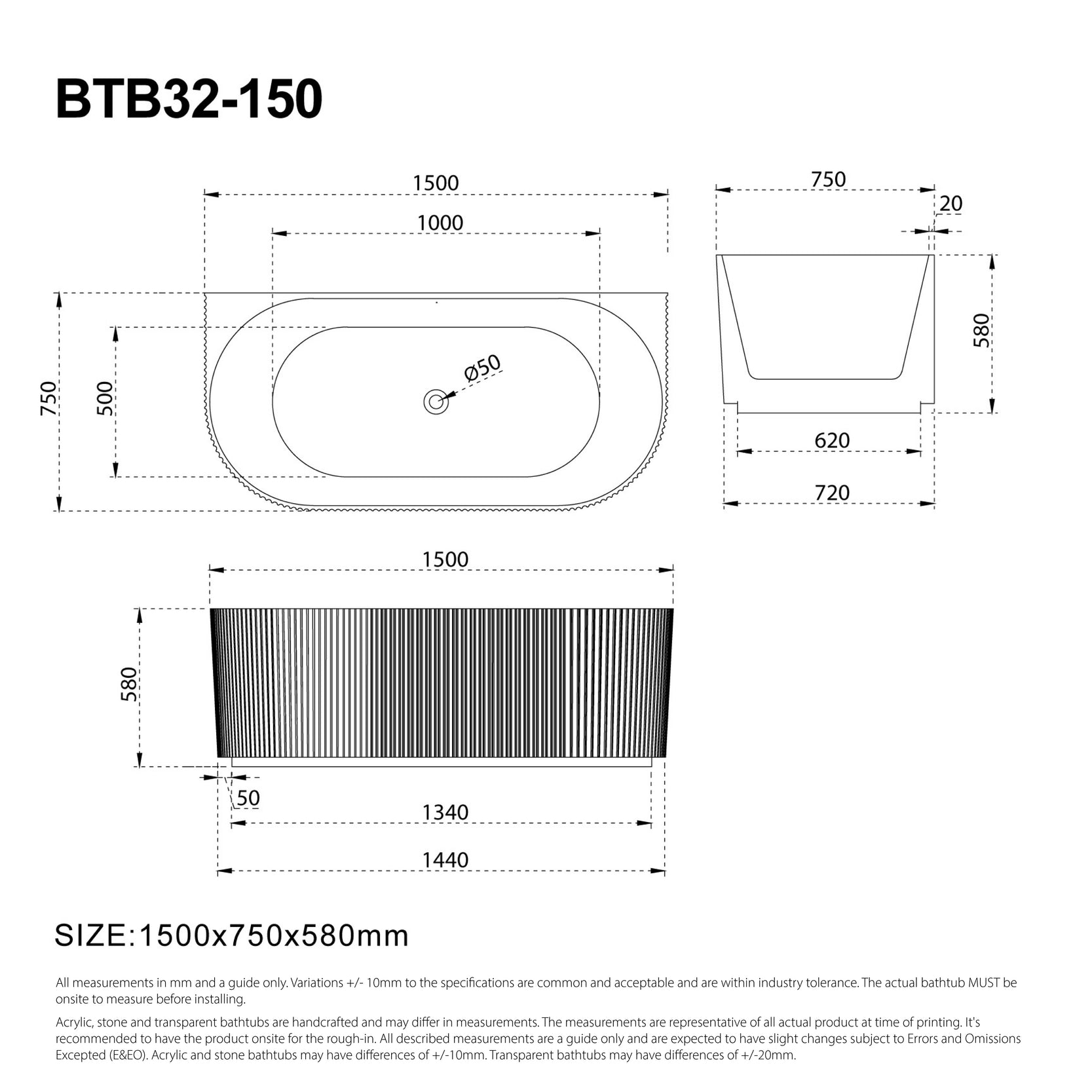 * Acrylic, stone and transparent bathtubs are handcrafted and may differ in measurements. The measurements are representative of all actual product at time of printing. It's recommended to have the product onsite for the rough-in. All described measurements are a guide only and are expected to have slight changes subject to Errors and Omissions Excepted (E&EO). Acrylic and stone bathtubs may have differences of +/-10mm. Transparent bathtubs may have differences of +/-20mm.