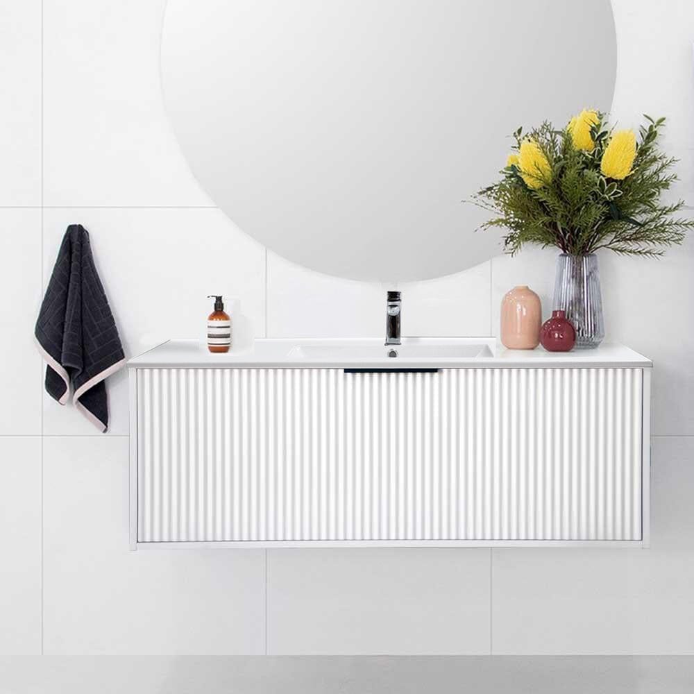 The matte white fluted vertical grain design of the Avery allows for creativity in how it's employed in your bathroom which gives an elegant and luxurious feel. Avery 1200mm bathroom wall-hung vanity is fitted with one large full extension drawer giving you full access to day-to-day consumables. The soft-close drawer also comes with a U-shaped cut-out for easy plumbing. Avery wall-hung bathroom vanity can be installed with either a ceramic vanity top with an integrated basin or an engineered quartz stone countertop with an above-counter basin of your choice.