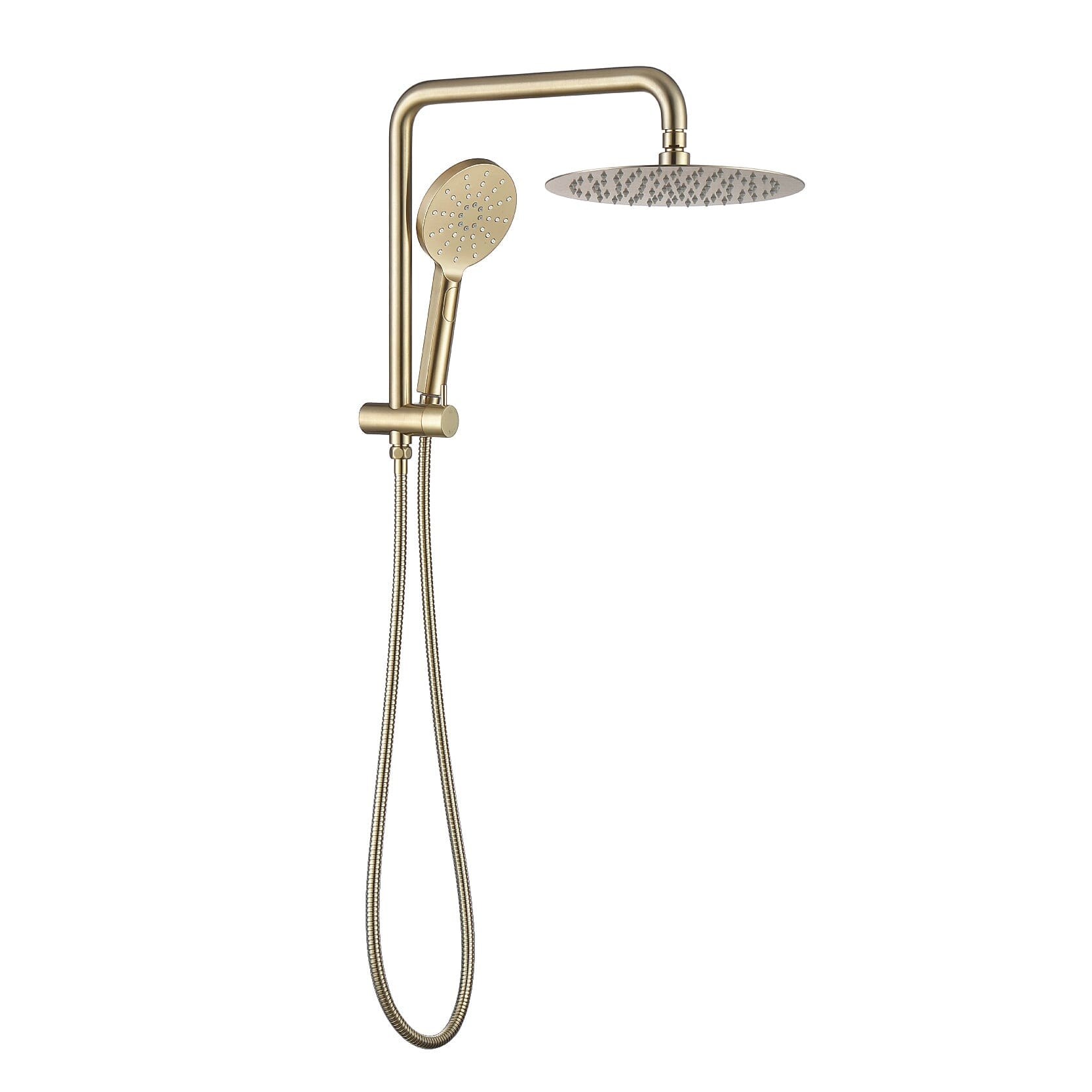 The CLIO compact rain shower with hand held rail is a modern and stylish shower set that combines both an overhead rain shower and a hand held shower head in a stunning brushed gold finish. The 345 mm high shower features a construction of solid brass and a built-in divertor for an easy switch between an overhead rose and handheld shower head. When renovating, simply add a wall mixer in brushed gold with a square design to turn water on/off and adjust the flow.