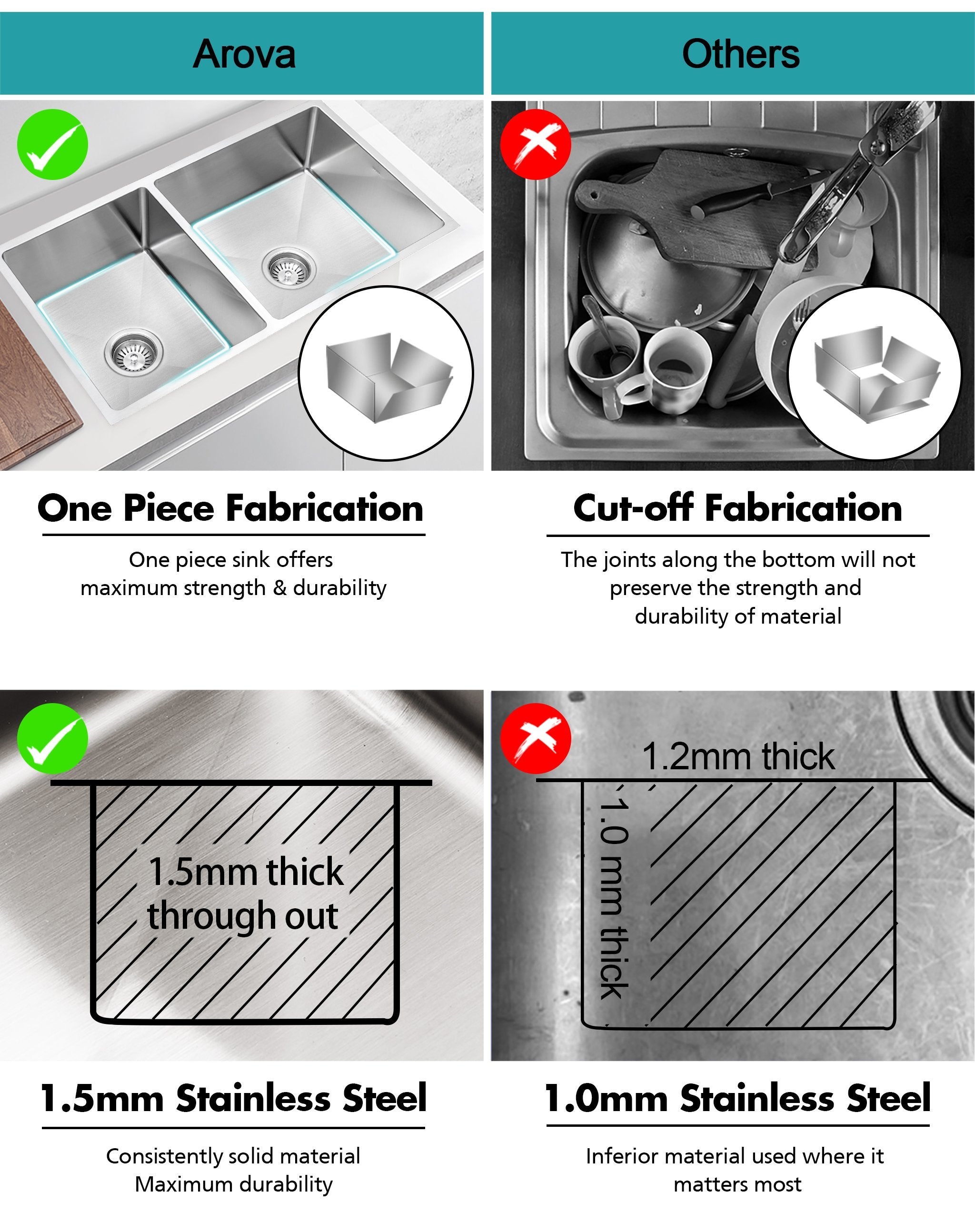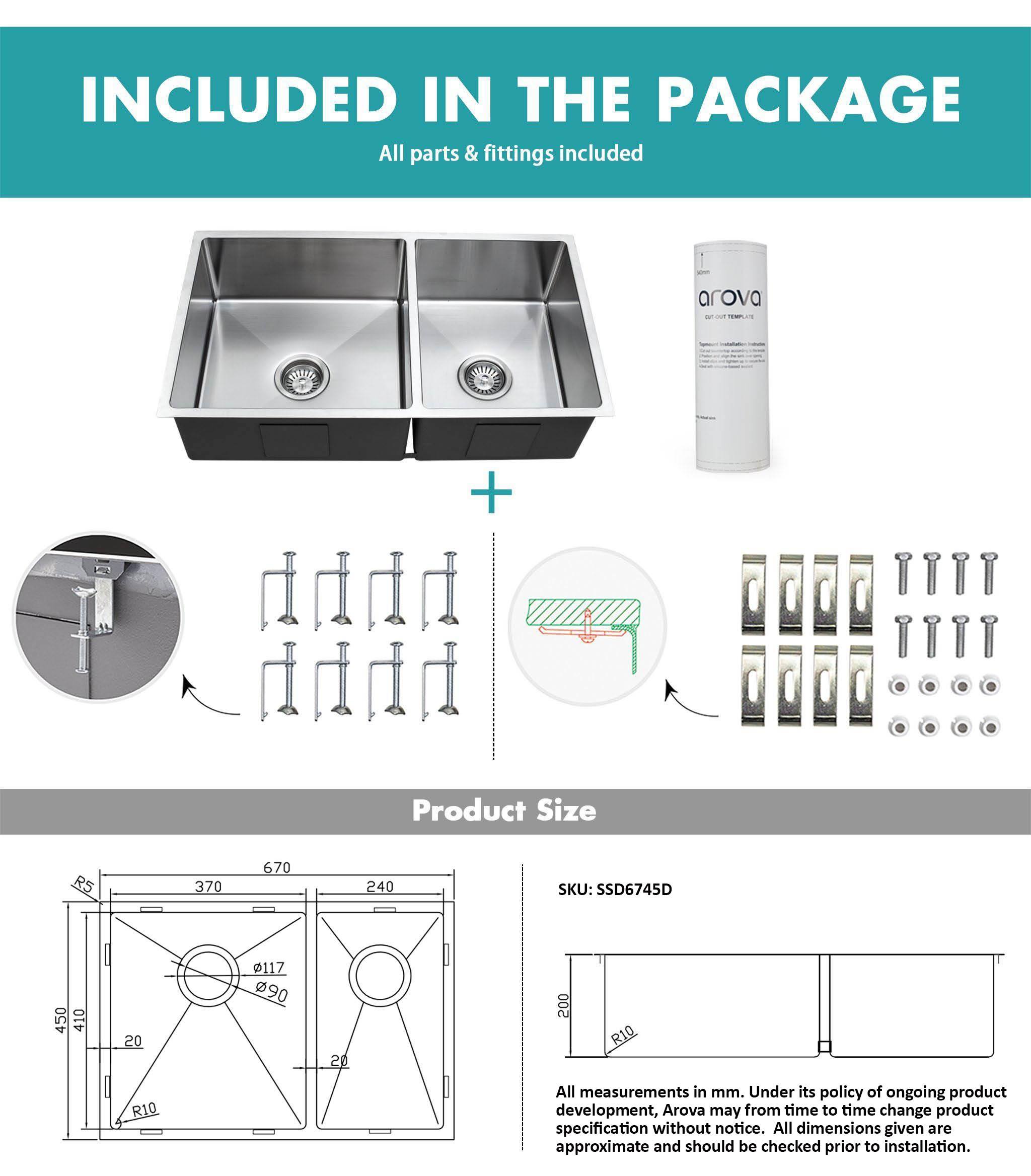 The Ultimo 1 & 1/2 by Arova combines design, premium quality, and maximum functionality all in one. It is an inset square basin that is high-quality and sleek. Useful for all uses, such as washing large pots or pans, it is handmade with one singular 18/10 premium stainless steel piece(1.5mm thick). New and fresh, they are sure to add a pop to your kitchen. The SSD6745D 1 & 1/2 sink is handcrafted with 5mm radius corners for easy cleaning and then finished with the finest satin look. The Ultimo 30L+20L sink is fitted with soundproof pads to reduce the noise and retain water temperature. The sink also comes with an anti-condensation coating and rear waste outlets.